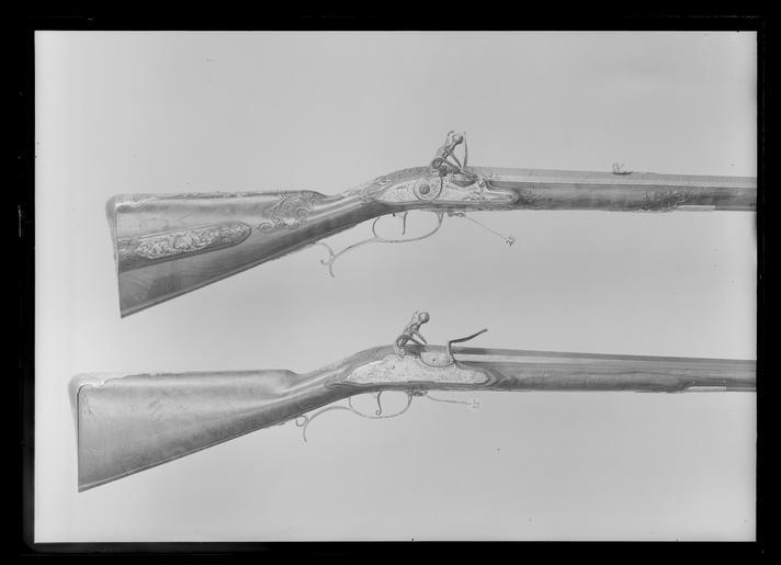 | Keywords: Hjullåspistol, puffert, Nordtyskland (Braunschweig?) ca 1560-1570 - Livrustkammaren - 51981.tif Rund pipa med svag trumf och åttsidig kammare kort försänkt i vinkel böjt svansskruvblad dolt av kolvplåten Pipans ovansida helt täckt av etsad och delvis förgylld dekor ett förgyllt tvärband i båda ändar på pipan och däremellan rankdekor mot prickbakgrund På den kantiga delen en förgylld man helbild profil h barett med plym midjekort mantel pluderhosor värja På den runda delen en kvinna helbild profil v lång veckad kjol med tvärbårder överdel med långa hängande ärmar kort plagg över axlarna v hand vid midjan h hand lyft framför ansiktet hållande spegel runt föremål med hundliknande drag skaft Båda figurerna står i fält som framtill avslutas med trepassformig båge med krön i form av fransk lilja Pipans undersida endast grovfilad <br/>Fästning Två häften Pipan fäst med krysskruv samt två pipstift av stål <br/><br/>Hjullås med plant låsbleck med delvis fasade kanter Låsblecket täckt av etsad dekor med bladrankor mot prickbakgrund kantbård av omväxlande tre runda och ett avlångt blankt fält Utvändigt hjul täckt av en rombisk platta och därpå stödram i form av två från nederkanten utstickande från varandra vända etsade drakhuvuden förenade dels nertill dels genom båge med prickdekor ovanför hjulaxeln Drakarna och den rombiska plattan fästade med en skruv genom vardera drakhuvudet Kantig fängpanna på ytterkanten och bakkanten en plan skiva med svängd kant som tillsammans med fängpannas lock bildar en halvcirkel fängpannelocket saknas På skivans ovansida hakan av en grotesk mask jfr nr 17584 På låsbleckets kant därframför en etsad bladranka <br/>Hane med rak kantig kropp på framsidan en utskjutande platta med rundad kant framför käkskruven lös överkäke med antydan till fingergrepp käkskruv med litet fyrsidigt huvud På hanens utsida grövre rankdekor samt antydan till drakhuvud på käkarna Hanfjäder med framtill rundad utsida filade bladrankor dubbelt kraftigt fjäderlöv med dekor som på hanen ena bladet nedanför hjulet det andra uppåtriktat <br/>Låset invändigt svärtat Stor konturerad täckplatta från avtryckare till hjulaxel odjurshuvud framtill <br/>Säkring På låsbleckets bakre del en virvelsäkring L-formig bygel med lång profilerad främre arm avslutad med stort fjäderlöv bakom bygeln ett löv som täcker hela låsbleckets plana del och tvär avslutas vid tungan som skjuts in under kolvplåten Säkring med rinformigt platt grepp profilerad fjäder med dubbelt fjäderlöv som hanfjäderns Fästning Två låsskruvar den bakre samtidigt fästskruv för bältehaken <br/>Avtryckare Rak avtryckare fäst med skruv i kolvplåten <br/><br/>Helstock av stål med i vinkel böjd kolv avslutad med kolvkula kolvkulan delad i två halvor förenade med gångjärn på undersidan fjädrande spärr som nås genom hål i kolvkulan Kolvhalsen rundad framtill en ring med pärlstavsdekor Låsdelen av kolven samt framstocken kantiga sluten laddstocksränna framstocken därframför rundad <br/>Heltäckande etsad dekor i fält åtskilda av blanka linjer fältens botten prickad därpå rankmönster På kolvkulans yttre del bladrankor amt ovanför mittknappen en tom renässanssköld sköldhållare två lejon På kolvkulans fasta del dekor i form av stora flikiga framåtriktade blad På kolvhalsens runda del fem rektangulära fält på ovansidan två med en naken man i det ena och en naken kvinna i det andra halvt vända mot varandra draperingar över skötena På sidorna ytterligare en naken kvinna vänd mot mannen samt på den andra sidan en man i antik rustning och med kroksabel På undersidan en man likaså i antik rustning men med sköld stödd mot marken dessa två är vända mot varandra På kolvryggen därframför fram till pipan ett stort fält med en man i helfigur profil v antik rustning med lejonmaskaron på axeln pluderhosor på huvudet kaskett med plym v hand vid midjan h hand lyft hållande yxa Hela anslagssidan av stocken täcks av ett sotrt fält med bladrankor samt mellan låsskruvarna en ryttare vänd framåt hög hatt med plym dräkt med pluderhosor bakom ryttaren en hund framför honom en hare en hund och en hare På kolvens undersida ett fät runt avtryckaren samt ett fält därframför med bladrankor samt två fåglar d en främre en sittande papegoja På laddstocksrännan längsgående dekor i form av en bladranka hund och hare Som överrörka och näsband ett tvärband med förgylld rankdekor I övrigt har samtliga större figurmotiv rester av förgyllning <br/><br/>Tillbehör <br/>Laddstock av stål l 318 mm original caption ca other date - 1560 1570 steel e1279 - eldvapen - pipa lås stockbeslag och laddstock material stål g 2220 size mm 340 pipa size mm 544 LRK Erik XIV av Sverige Gustav II Adolf av Sverige Tre Konungar på Åbo slott 1993 place of origin original filename LN_B03306_006186 54178 inventory number LRK 17583 51981 CC0 Hjullåspistol puffert Nordtyskland Braunschweig ca 1560-1570 - Livrustkammaren - 51981-negative tif <gallery caption Different images of same object > File Hjullåspistol puffert Nordtyskland Braunschweig ca 1560-1570 - Livrustkammaren - 43271 tif File Hjullåspistol puffert Nordtyskland Braunschweig ca 1560-1570 - Livrustkammaren - 26246 tif </gallery> Wheellock pistol images from Livrustkammaren Media contributed by LSH dim-with multiple size templates Media contributed by LSH 2013-10 Hjullåspistol, puffert, Nordtyskland (Braunschweig?) ca 1560-1570 - Livrustkammaren - 51981.tif Rund pipa med svag trumf och åttsidig kammare kort försänkt i vinkel böjt svansskruvblad dolt av kolvplåten Pipans ovansida helt täckt av etsad och delvis förgylld dekor ett förgyllt tvärband i båda ändar på pipan och däremellan rankdekor mot prickbakgrund På den kantiga delen en förgylld man helbild profil h barett med plym midjekort mantel pluderhosor värja På den 