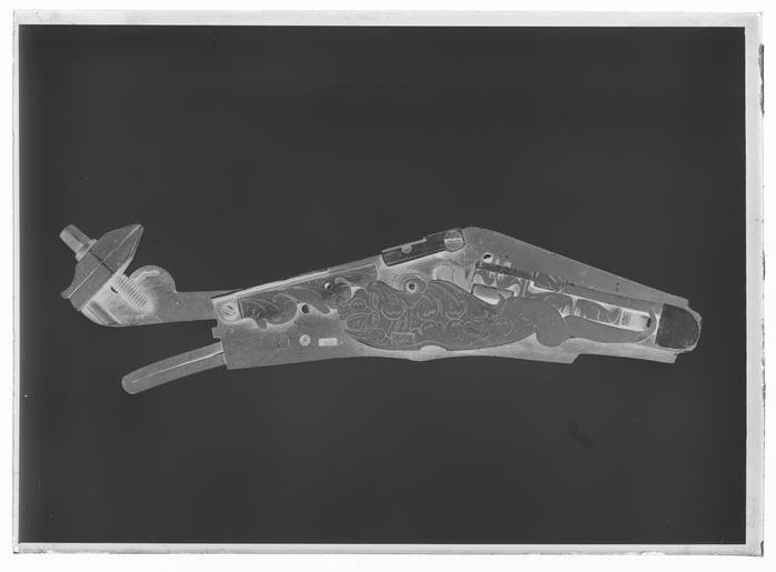 | Keywords: Hjullåspistol, puffert, Nordtyskland (Braunschweig?) ca 1560-1570 - Livrustkammaren - 598-negative.tif Rund pipa med svag trumf och åttsidig kammare kort försänkt i vinkel böjt svansskruvblad dolt av kolvplåten Pipans ovansida helt täckt av etsad och delvis förgylld dekor ett förgyllt tvärband i båda ändar på pipan och däremellan rankdekor mot prickbakgrund På den kantiga delen en förgylld man helbild profil h barett med plym midjekort mantel pluderhosor värja På den runda delen en kvinna helbild profil v lång veckad kjol med tvärbårder överdel med långa hängande ärmar kort plagg över axlarna v hand vid midjan h hand lyft framför ansiktet hållande spegel runt föremål med hundliknande drag skaft Båda figurerna står i fält som framtill avslutas med trepassformig båge med krön i form av fransk lilja Pipans undersida endast grovfilad <br/>Fästning Två häften Pipan fäst med krysskruv samt två pipstift av stål <br/><br/>Hjullås med plant låsbleck med delvis fasade kanter Låsblecket täckt av etsad dekor med bladrankor mot prickbakgrund kantbård av omväxlande tre runda och ett avlångt blankt fält Utvändigt hjul täckt av en rombisk platta och därpå stödram i form av två från nederkanten utstickande från varandra vända etsade drakhuvuden förenade dels nertill dels genom båge med prickdekor ovanför hjulaxeln Drakarna och den rombiska plattan fästade med en skruv genom vardera drakhuvudet Kantig fängpanna på ytterkanten och bakkanten en plan skiva med svängd kant som tillsammans med fängpannas lock bildar en halvcirkel fängpannelocket saknas På skivans ovansida hakan av en grotesk mask jfr nr 17584 På låsbleckets kant därframför en etsad bladranka <br/>Hane med rak kantig kropp på framsidan en utskjutande platta med rundad kant framför käkskruven lös överkäke med antydan till fingergrepp käkskruv med litet fyrsidigt huvud På hanens utsida grövre rankdekor samt antydan till drakhuvud på käkarna Hanfjäder med framtill rundad utsida filade bladrankor dubbelt kraftigt fjäderlöv med dekor som på hanen ena bladet nedanför hjulet det andra uppåtriktat <br/>Låset invändigt blankt Stor framtill konturerad täckplatta från avtryckare till hjulaxel odjurshuvud framtill Stångtanden saknas <br/>Säkring På låsbleckets bakre del en virvelsäkring L-formig bygel med lång profilerad främre arm avslutad med stort fjäderlöv bakom bygeln ett löv som täcker hela låsbleckets plana del och tvär avslutas vid tungan som skjuts in under kolvplåten Säkring med rinformigt platt grepp profilerad fjäder med dubbelt fjäderlöv som hanfjäderns Fästning Två låsskruvar den bakre samtidigt fästskruv för bältehaken <br/>Avtryckare Rak avtryckare fäst med skruv i kolvplåten <br/><br/>Helstock av stål med i vinkel böjd kolv avslutad med kolvkula kolvkulan delad i två halvor förenade med gångjärn på undersidan fjädrande spärr som nås genom hål i kolvkulan Kolvhalsen rundad framtill en ring med pärlstavsdekor Låsdelen av kolven samt framstocken kantiga sluten laddstocksränna framstocken därframför rundad <br/>Heltäckande etsad dekor i fält åtskilda av blanka linjer fältens botten prickad därpå rankmönster dekoren uppbygd på samma sätt som på nr 17583 men något avvikande utförande På kolvkulans yttre del bladrankor amt ovanför mittknappen en tom renässanssköld sköldhållare två lejon På kolvkulans fasta del dekor i form av stora flikiga framåtriktade blad På kolvhalsens runda del fem rektangulära fält på ovansidan två med en naken man i det ena och en naken kvinna i det andra halvt vända mot varandra draperingar över skötena På sidorna ytterligare en naken kvinna vänd mot mannen samt på den andra sidan en naken man på undersidan en naken kvinna På kolvryggen därframför fram till pipan ett stort fält med en man i helfigur profil v pluderhosor åtsittande jacka på huvudet en hög hatt med fjäder v hand vid midjan h hand lyft hållande spjut Hela anslagssidan av stocken täcks av ett sotrt fält med bladrankor samt mellan låsskruvarna en ryttare vänd framåt hög hatt med plym dräkt med pluderhosor bakom ryttaren en hund framför honom en hare en hund och en hare samma som på parpistolen men med avvikande hållning och detaljer På kolvens undersida ett fät runt avtryckaren samt ett fält därframför med bladrankor samt två fåglar den sittande papegojan placerad vid varbygelns fästskruv omvänd placering mot parpistolens På laddstocksrännan längsgående dekor i form av en bladranka hund och hare Som överrörka och näsband ett tvärband med förgylld rankdekor I övrigt har samtliga större figurmotiv rester av förgyllning <br/><br/>Tillbehör <br/>Laddstock av stål l 318 mm original caption ca other date - 1560 1570 steel e1237 - eldvapen - pipa lås stock och beslag material stål - wood e9 - eldvapen - laddstock material trä g 2200 size mm 341 pipa size mm 539 LRK Gustav II Adolf av Sverige Erik XIV av Sverige Tre Konungar på Åbo slott 1993 place of origin original filename LN_B03100_005980 54179 inventory number LRK 17584 598 CC0 Hjullåspistol puffert Nordtyskland Braunschweig ca 1560-1570 - Livrustkammaren - 598 tif Hjullåspistol, puffert, Nordtyskland (Braunschweig?) ca 1560-1570 - Livrustkammaren - 598-negative.tif Rund pipa med svag trumf och åttsidig kammare kort försänkt i vinkel böjt svansskruvblad dolt av kolvplåten Pipans ovansida helt täckt av etsad och delvis förgylld dekor ett förgyllt tvärband i båda ändar på pipan och däremellan rankdekor mot prickbakgrund På den kantiga delen en förgylld man helbild profil h barett med plym midjekort mantel pluderhosor värja På den runda delen en kvinna helbild profil v lång veckad kjol med tvärbårder överdel med långa hängande ärmar kort plagg över axlarna v hand vid midjan h hand lyft framför ansiktet hållande spegel runt föremål med hundliknande drag skaft Bå