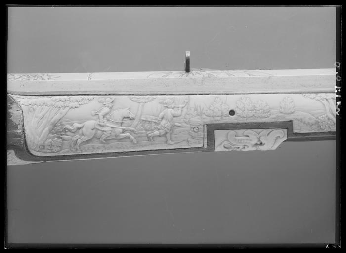 | Keywords: Hjullåsstudsare, Westphalen cirka 1660 - Livrustkammaren - 27629.tif LSH artwork sv Åttsidig sjuräfflad pipa bombredd 2 8 mm Rektangulärt svansskruvblad På kammaren en sköldformig stämpel med hand och därovanför tre otydliga bokstäver G H N LRK vägl 1921 155 Dekor i form av graverade blomrankor på kammaren runt siktet och bakom kornet På kammaren dessutom ett fält med landskap med en man och fyra springande hundar Riktmedel Ståndsikte av stål med bred u-formig skärm Spolformigt korn av mässing båda inlaxade Fästning Pipan fäst med krysskruv underifrån främre varbygelskruven samt tre pipstift av trä Hjullås av tysk typ plant låsbleck l 205 mm Dekor i form av graverade blomrankor i låg relief mot mörkskrafferad bakgrund Bakom hjulet ett ovalt fält med landskap däri ryttare som förföljer en springande hjort två hundar Utanpåliggande hjul fäst med halvcirkelformig uppåt breddad ring fäst med två skruvar kl 3 och 9 Svängd eldskärm avslutad med horisontell hjärtformig spets Fängpannelock med rörlig arm lockets framkant fasad och försedd med graverad dekor svängt rundat fingergrepp framtill avslutat med ett treflikigt blad Hane med fyrsidig kropp med rundad räfflad utsida ringformig hanhals med stor skärm lös överkäke Hals och käkar graverade som fågelhuvuden Uppåtböjt fingergrepp avslutat med en rund platt med spiralgravering Käkskruv med fyrsidigt huvud upptill koniskt med kulformig avslutning Hanfjäder med fasade kanter konturerad studel med glasögonformig genombrytning Avtryckarstången och fängpannelockets stoppfjädrar blånerade Fästning Två låsskruvar Avtryckare med konturerat och profilerat snälltryck Helstock av rödmålat trä rödbok nästan helt täckt med elfenbensplattor med snidad dekor Kolv av tysk typ med kolvlåda och vinge framtill avslutad med volut Den snidade dekoren föreställer landskap med jaktscener se Hellner Kolvlådelock av elfenben Kolvkula av stål Spetsrörka av elfenben med maskaron Topprörka och näsband samt bakplåten saknas Bred varbygel av stål med tre fingerlägen korta genombrutna armar på bygeln graverad rankdekor samt ovalt fält med landskap med jägare hund och hjort Tillbehör Laddstock av rödmålat trä l 742 mm i ena änden ett invändigt gängat stålrör l 119 mm Gåva till Karl XI från landshövdingen friherre Augustin Leijonsköld 1634-1682 original caption ca 1660 ivory e8 - eldvapen - stockdekor material elfenben - steel e1247 - eldvapen - pipa lås riktmedel och beslag material stål - brass e4 - eldvapen - riktmedel material mässing - beech e3 - eldvapen - stock material rödbok size mm 775 pipa size mm 1068 g 4430 LRK Karl XI av Sverige Augustin Leijonsköld Jakt 1973 Läckö slott Tre Karlar 1984-1985 Trofast - hov och tass i kunglig tjänst 2010-2011 Livrustkammaren Trogna vänner - Kungliga hästar och hundar 2011-2012 Museiverket/Finlands nationalmuseum basutställning G H N hand 1921 155 anv e1 - eldvapen - pipa; anonym pipsmed place of origin original filename LN_B16583_019463 39529 inventory number LRK 2919 27629 CC0 Hjullåsstudsare Westphalen cirka 1660 - Livrustkammaren - 27629-negative tif <gallery caption Different images of same object > File Bössa elfenben - Livrustkammaren - 86497 tif File Hjullåsstudsare Westphalen cirka 1660 - Livrustkammaren - 19075 tif File Hjullåsstudsare Westphalen cirka 1660 - Livrustkammaren - 19100 tif File Hjullåsstudsare Westphalen cirka 1660 - Livrustkammaren - 36190 tif File Hjullåsstudsare Westphalen cirka 1660 - Livrustkammaren - 10505 tif File Hjullåsstudsare - Livrustkammaren - 95342 tif File Hjullåsstudsare Westphalen cirka 1660 - Livrustkammaren - 53308 tif File Hjullåsstudsare Westphalen cirka 1660 - Livrustkammaren - 19067 tif File Hjullåsstudsare Westphalen cirka 1660 - Livrustkammaren - 44747 tif File Hjullåsstudsare Westphalen cirka 1660 - Livrustkammaren - 61869 tif File Hjullåsstudsare Westphalen cirka 1660 - Livrustkammaren - 44748 tif File Hjullåsstudsare Westphalen cirka 1660 - Livrustkammaren - 10538 tif File Hjullåsstudsare Westphalen cirka 1660 - Livrustkammaren - 1978 tif File Bössa elfenben - Livrustkammaren - 86498 tif </gallery> Muskets Media contributed by LSH dim-with multiple size templates Media contributed by LSH 2016-12 |