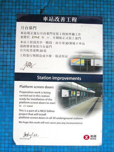| Keywords: HK-MTR-Admiralty-PSD-Poster.JPG Description <br> Station Improvements poster regarding Platform Screen Doors<br> Admiralty Station<br> Island Line<br> Mass Transit Railway<br> Hong Kong<br> <br> Source Photograph taken by Edison<br> Date 2003 Jan 18<br> License <br> Originally <br> cc-by-sa-2 0 Since 2011 Nov 24 <br> Safety posters Signs in Hong Kong Admiralty Station Full-height platform screen doors in Hong Kong MTR | ||||