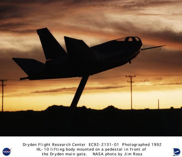 Keywords: HL-10 mounted on a pedestal in front of the Dryden main gate at sunset DVIDS727763.jpg en The HL-10 Lifting Body as shown here is currently displayed on a pedestal in front of the main gate at NASA's Dryden Flight Research Center Edwards California The HL-10 was one of five heavyweight lifting-body designs flown at NASA's Flight Research Center FRC--later Dryden Flight Research Center Edwards California from July 1966 to November 1975 to study and validate the concept of safely maneuvering and landing a low lift-over-drag vehicle designed for reentry from space Northrop Corporation built the HL-10 and M2-F2 the first two of the fleet of heavy lifting bodies flown by the NASA Flight Research Center The contract for construction of the HL-10 and the M2-F2 was 1 8 million HL stands for horizontal landing and 10 refers to the tenth design studied by engineers at NASA's Langley Research Center Hampton Va After delivery to NASA in January 1966 the HL-10 made its first flight on Dec 22 1966 with research pilot Bruce Peterson in the cockpit Although an XLR-11 rocket engine was installed in the vehicle the first 11 drop flights from the B-52 launch aircraft were powerless glide flights to assess handling qualities stability and control In the end the HL-10 was judged to be the best handling of the three original heavy-weight lifting bodies M2-F2/F3 HL-10 X-24A The HL-10 was flown 37 times during the lifting body research program and logged the highest altitude and fastest speed in the Lifting Body program On Feb 18 1970 Air Force test pilot Peter Hoag piloted the HL-10 to Mach 1 86 1 228 mph Nine days later NASA pilot Bill Dana flew the vehicle to 90 030 feet which became the highest altitude reached in the program Some new and different lessons were learned through the successful flight testing of the HL-10 These lessons when combined with information from it's sister ship the M2-F2/F3 provided an excellent starting point for designers of future entry vehicles including the Space Shuttle NASA Identifier NIX-EC92-2131-01 2009-09-23 Glenn Research Center https //www dvidshub net/image/727763 727763 2012-10-17 14 16 WASHINGTON DC US PD-USGov Northrop HL-10 Images from DoD uploaded by Fæ |