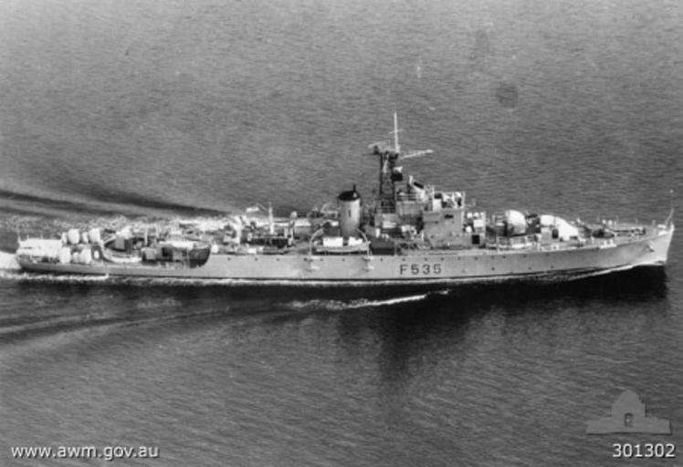 | Keywords: HMAS Shoalhaven.jpg AWM Caption C 1954 AERIAL STARBOARD SIDE VIEW OF THE FRIGATE HMAS SHOALHAVEN F535 SHE HAS A HEDGEHOG ANTI SUBMARINE MORTAR ON HER FORECASTLE AND TWIN 4 INCH MARK XVI GUNS IN MARK XIX MOUNTINGS FORWARD AND AFT THREE 40 MM BOFORS AA GUNS ARE MOUNTED AFT THE TWIN 20 MM OERLIKON GUNS FORMERLY FITTED IN THE BRIDGE WINGS HAVE BEEN REPLACED BY TWO MORE BOFORS GUNS THE 4 INCH GUNS ARE CONTROLLED BY THE HIGH ANGLE DIRECTOR ON THE BRIDGE WHICH IS EQUIPPED WITH TYPE 285 FIRE CONTROL RADAR HER ORIGINAL POLE MAST WITH SC-1 RADAR AT THE MASTHEAD HAS BEEN REPLACED BY A LATTICE MAST WITH A TYPE 293 RADAR AT ITS HEAD THE TYPE 276 RADAR HAS BEEN RETAINED THE FIGURE 1 ON HER FUNNEL INDICATES THAT SHE IS A MEMBER OF THE 1ST FRIGATE SQUADRON NAVAL HISTORICAL COLLECTION 301302 Sourced from http //www awm gov au/database/collection asp <br>Originally uploaded to en Wikipedia as en Image HMAS Shoalhaven jpg by en User Hossen27 7 February 2007 ~ 1954 Photographer not identified The AWM record for this photo states that the copyright status is 'clear' The photo was taken in 1954 Copyright expired 50 years en Image HMAS Shoalhaven jpg PD-AustraliaGov DEFAULTSORT Shoalhaven Aerial photographs of naval ships of Australia Shoalhaven HMAS Shoalhaven K535 Shoalhaven Black and white photographs |