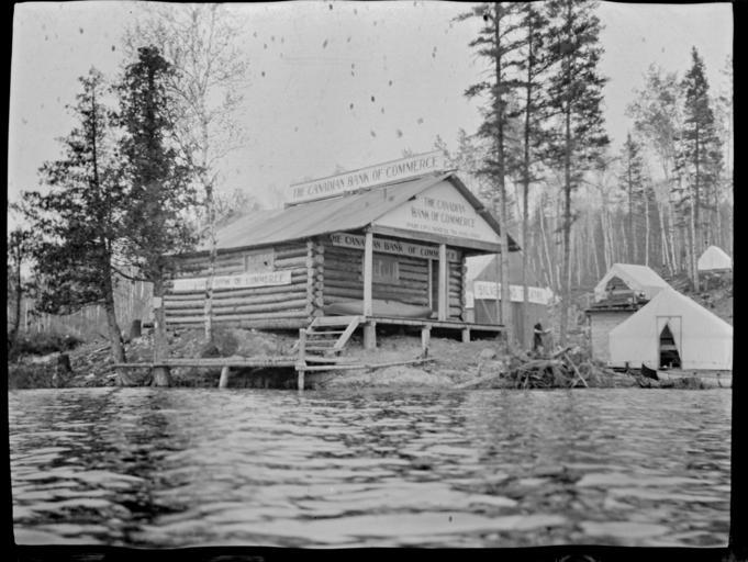 Keywords: bank buildings bankbuildings canoes 1900s gowganda theatres log cabins logcabins camping blackandwhite monochrome outdoor black and white "Bank of Commerce & Baxters Hotel - Gow Ganda" View of the Canadian Bank of Commerce building in Gowganda, taken from the lake. The bank was built of logs and there is a canoe on the bank's veranda. The building behind the bank has the words SILVER..NO THEATRE just visible upon it. One of a set of photographs from a trip to "Gow Ganda", May 19 - June 28, 1909. "Bank of Commerce & Baxters Hotel - Gow Ganda" View of the Canadian Bank of Commerce building in Gowganda, taken from the lake. The bank was built of logs and there is a canoe on the bank's veranda. The building behind the bank has the words SILVER..NO THEATRE just visible upon it. One of a set of photographs from a trip to "Gow Ganda", May 19 - June 28, 1909. |
