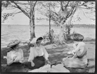 Keywords: 1900s women clothes lakes crockery blackandwhite monochrome outdoor black and white "Mrs March, Gladys & Jeanette, Grassy Point picnic, Aug '09" Three women taking tea by the side of the Bay of Quinte in Prince Edward County, Ontario. Jeanette may be Jeanette McMurrich Rathbun, the photographer's cousin (daughter of Frederick Sherwood Rathbun and Jean McMurrich, born 1888). Photograph taken in August 1909. "Mrs March, Gladys & Jeanette, Grassy Point picnic, Aug '09" Three women taking tea by the side of the Bay of Quinte in Prince Edward County, Ontario. Jeanette may be Jeanette McMurrich Rathbun, the photographer's cousin (daughter of Frederick Sherwood Rathbun and Jean McMurrich, born 1888). Photograph taken in August 1909. |