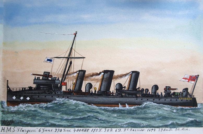 Keywords: HMS Sturgeon by James Scott Maxwell.png Royal Navy destroyer HMS Sturgeon 1894 antique watercolour 1901 James Scott-Maxwell public domain Destroyers of the United Kingdom Paintings of ships James Scott Maxwell PD-old-100