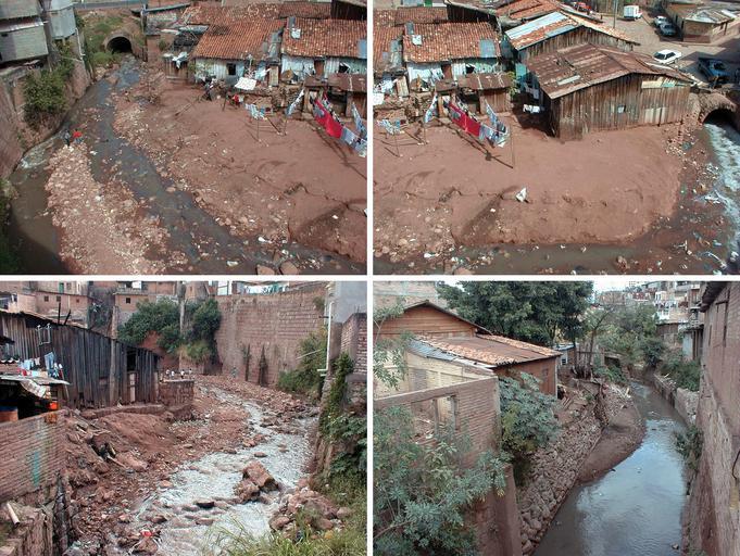 Keywords: HN99cTeguci RioMidTwnU.jpg Three photos from what I call The Bug U with the lowerleft shot taken further upstream <br> Camera Info OLYMPUS SR83 Digital<br> Contact creator at http //Stockhausen yojoa org - This image is also available there under the directory link <u>Composite Group 01</u> as a multi-layer xcf file own 1999 Zack Clark ZackClark Tegucigalpa Poverty in Honduras Rivers of Honduras Montages of cities in Honduras |