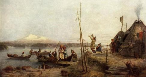 | Keywords: Höckert Brudfärd på Hornavan.jpg Brudfärd på Hornavan Oljemålning Ett lapskt brudpar landar vid Hornavans strand efter att ha blivit sammanvigt i något litet kapell Den vitklädda med brudbälte och krona smyckade bruden skall just stiga i land stödd av brudgummen Tvenne båtar följa den ena med bröllopsgäster den andra med enroddare och diverse packning Ur den närliggande kåtans taköppning bolmar röken De hemmavarande ha tillrett en präktig bröllopsmåltid bestående av kokt och stekt färskt renkött kokta laxöringar och foreller vildfågelsägg samt till efterrätt joama kraftse en sorts kräm av renmjölk blandad med saft av syrgräs Dessutom har från nybyggarna dagen till ära anskaffats potatis smör och tunnbröd Såsom dryck användes renmjölk blandad med snö samt kaffe Till det senare serveras tunna skivor av renost Å den vackra målningen avteckna sig i bakgrunden snötäckta fjäll mot blekblå vårhimmel - Gerda Cederblom http //libris kb se/bib/1471188 1858 Johan Fredrik Höckert 1826-1866 Paintings from Sweden by Johan Fredrik Höckert PD-old Uncategorized 2016 June 13 |
