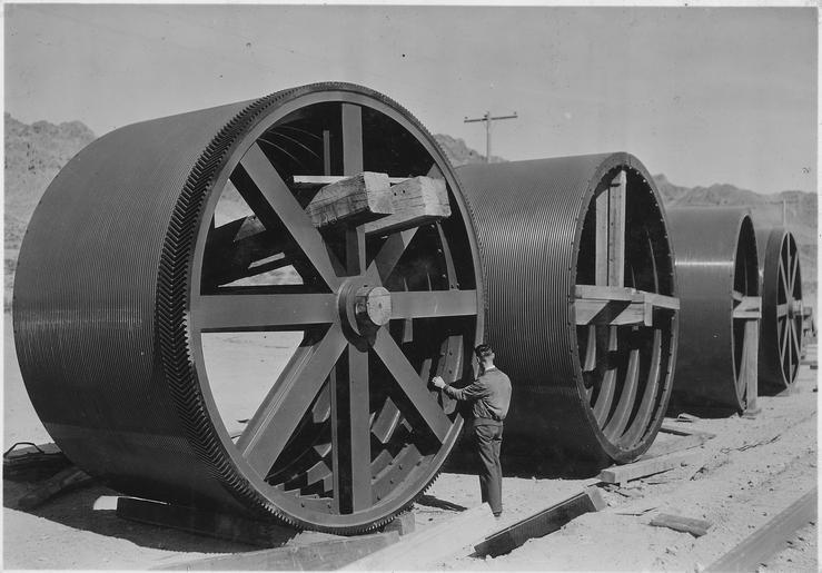 | Keywords: Hoisting drums for permanent 150-ton cableway in storage at Boulder City yards - NARA - 293820.tiff Scope and content Photograph from Volume Two of a series of photo albums documenting the construction of Hoover Dam Boulder City Nevada General notes 293820 Local identifier Department of the Interior Bureau of Reclamation Engineering and Research Center 05/18/1981 - 03/04/1988 NARA's Rocky Mountain Region Denver NRGA Building 48 Denver Federal Center West 6th Avenue and Kipling Street Denver CO 80225-0307 1933-03-26 Record group Record Group 115 Records of the Bureau of Reclamation 1889 - 2008 Record group ARC 444 Photograph albums compiled 1903 - 1972 Series ARC 293611 File unit File unit ARC Variant control numbers NAIL Control Number NRG-115-CONSTPHO85006-BC21571 yes Other versions <gallery> File Hoisting drums for permanent 150-ton cableway in storage at Boulder City yards - NARA - 293820 tiff tif File Hoisting drums for permanent 150-ton cableway in storage at Boulder City yards - NARA - 293820 jpg jpg </gallery> NARA-cooperation PD-USGov NARA TIF images with categorized JPGs Boulder City |