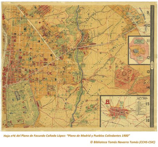 | Keywords: Hoja4 Plano FacundoCL.jpg  es Hoja 4 del Plano de Madrid en 1900 dibujado por Facundo Cañada Descripción física del plano total por el autor El plano consta de 6 hojas cada una de las cuales mide 59 cm de altura por 72 cm de ancho de trabajo por supuesto nada de anchos de cenefas y por lo tanto al unirlas forman un plano que mide 1 44 metros de ancho y 1 77 de alto y las márgenes en blanco se está tirando escrupulosamente en ocho colores y en superior papel hallándose perfectamente grabado Facundo Cañada López 1900 Descripción cartográfica del plato total Plano de Madrid y Pueblos colindantes de Aravaca Canillas Canillejas Carabanchel Alto Carabanchel Bajo Chamartín El Pardo Real Sitio Fuencarral Getafe Hortaleza Leganés Pozuelo de Alarcón con sus barrios de Húmera y Estación; Vallecas Vicálvaro Villaverde etc al principiar el siglo XX El plano va acompañado de una Guía con el Directorio de Madrid y otras notas aclaratorias Información estadística y nomenclator del plano por el autor La superficie del término municipal de Madrid de la época es de 821 189 581 pies cuadrados equivalentes a 18 621 fanegas del marco de Madrid o sean 6475 hectáreas y 54 áreas; resultando de dicha superficie una proporción de 120 52 metros cuadrados por habitante pues estos son 528 984 según el último empadronamiento general verificado en 1º de Diciembre de 1900 En el plano se fijan los nombres de las plazas calles callejones cuestas etc que en la actualidad tienen detallándose la numeración que a cada casa corresponde dentro de cada manzana pues se fijan los primeros y últimos números de cada una de éstas al principiar las calles y después los últimos en las manzanas sucesivas y de esta manera resulta toda la numeración de cada calle 1900 http //idehistoricamadrid org/hisdimad/documents/plano html Facundo Cañada PD-Scan PD-old-auto-1923 1913 cc-zero PD-old-auto 1913 Plano de Madrid y pueblos colindantes al empezar el siglo XX |