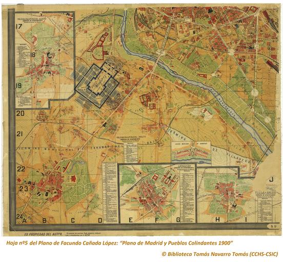 | Keywords: Hoja5 Plano FacundoCL.jpg  es Hoja 5 del Plano de Madrid en 1900 dibujado por Facundo Cañada Descripción física del plano total por el autor El plano consta de 6 hojas cada una de las cuales mide 59 cm de altura por 72 cm de ancho de trabajo por supuesto nada de anchos de cenefas y por lo tanto al unirlas forman un plano que mide 1 44 metros de ancho y 1 77 de alto y las márgenes en blanco se está tirando escrupulosamente en ocho colores y en superior papel hallándose perfectamente grabado Facundo Cañada López 1900 Descripción cartográfica del plato total Plano de Madrid y Pueblos colindantes de Aravaca Canillas Canillejas Carabanchel Alto Carabanchel Bajo Chamartín El Pardo Real Sitio Fuencarral Getafe Hortaleza Leganés Pozuelo de Alarcón con sus barrios de Húmera y Estación; Vallecas Vicálvaro Villaverde etc al principiar el siglo XX El plano va acompañado de una Guía con el Directorio de Madrid y otras notas aclaratorias Información estadística y nomenclator del plano por el autor La superficie del término municipal de Madrid de la época es de 821 189 581 pies cuadrados equivalentes a 18 621 fanegas del marco de Madrid o sean 6475 hectáreas y 54 áreas; resultando de dicha superficie una proporción de 120 52 metros cuadrados por habitante pues estos son 528 984 según el último empadronamiento general verificado en 1º de Diciembre de 1900 En el plano se fijan los nombres de las plazas calles callejones cuestas etc que en la actualidad tienen detallándose la numeración que a cada casa corresponde dentro de cada manzana pues se fijan los primeros y últimos números de cada una de éstas al principiar las calles y después los últimos en las manzanas sucesivas y de esta manera resulta toda la numeración de cada calle 1900 http //idehistoricamadrid org/hisdimad/documents/plano html CSIC-Biblioteca Tomás Navarro Tomás Facundo Cañada PD-Scan PD-old-auto-1923 1913 cc-zero PD-old-auto 1913 Plano de Madrid y pueblos colindantes al empezar el siglo XX |