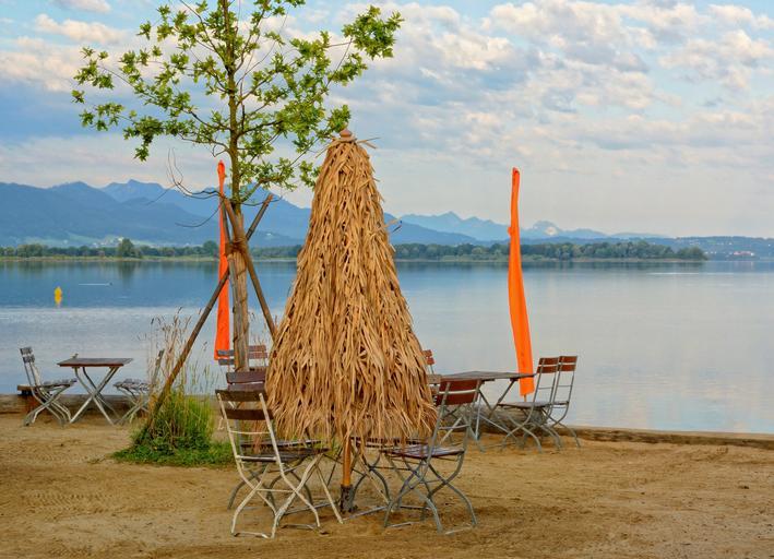 Keywords: holiday recovery beach summer lake garden furniture seat folding chairs travel still life chiemsee landscape
