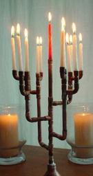 | Keywords: Holly Days Menorah.jPG  en 13 candle candelabra known as a Holly Days Menorah The image is of one made from 1/4 inch copper pipe with 12 candle positions to be lit on each of the 12 nights of Holly Days and one central Shamus candle Build by Anine Booth own Nesdon 2009-12-20 Cc-zero Menorah Candle chandeliers |