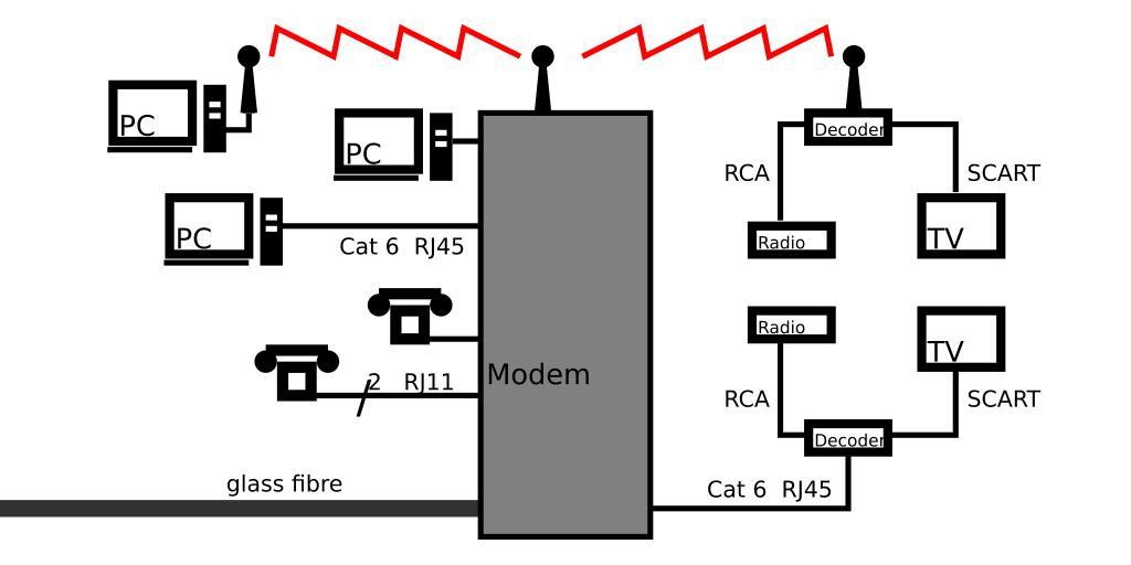 Keywords: Home connections glas.svg en How to connect telephone radio television internet via glass fibre own Handige Harrie 2010-01-09 PD Telephone diagrams Internet access Radio Television