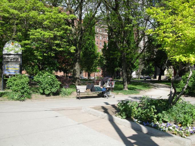 Keywords: Homeless man sleeping on a park bench NW corner of Church and Queen.jpg This homeless man was still apparently asleep at 19 30 am in the park at Queen and Church streets just east of St Mike's hospital in Toronto He was still sitting on this bench three hours later Note the shopping card with his neatly stacked belongings own 2012-05-19 Geo Swan <span class signature-talk >talk</span> Homeless people of Toronto Church Street Toronto Queen Street Toronto Park benches in Toronto Photographs by Geo Swan Taken with Canon PowerShot A2000 IS |