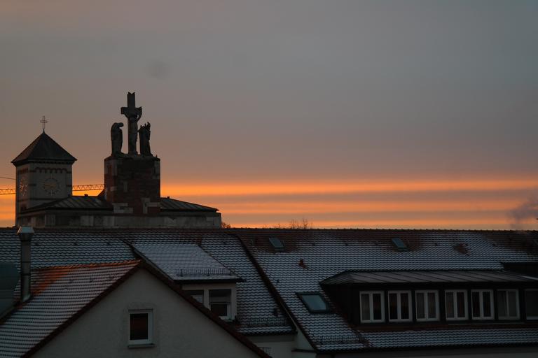 Keywords: homes church steeple abendstimmung sunset sky stripes orange