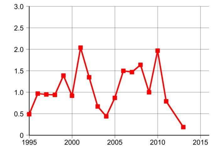 | Keywords: Homicide Rate in Luxembourg.svg en Homicide rate per 100 000 in Luxembourg Data taken from http //www indexmundi com/facts/luxembourg/homicide-rate 2016-08-17 own Delphi234 other versions current annually Generated with Wikimedia SVG Chart SVG Chart/box cc-zero Homicide rates Crime in Luxembourg Diagrams labelled with numbers only |