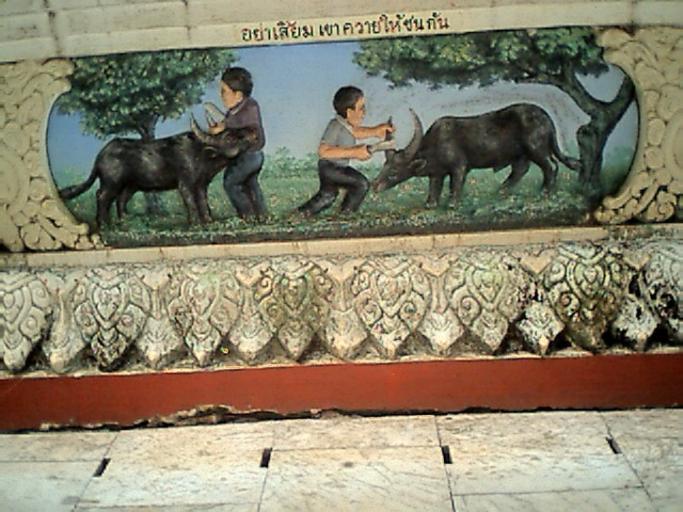 | Keywords: Honing Horns.JPG อย่า สี้ยม ขาควายให้ชนกัน -- Illustrated Proverb Don't hone horns for bulls to fight Phra That Phanom chedi Amphoe That Phanom Nakhon Phanom Province northeastern Thailand 2004-06-21 Pawyi Lee Public domain Reliefs in Thailand Wat Phra Tat Phanom Water buffaloes in art in Thailand bulls in art animal horns in art Thai proverbs |