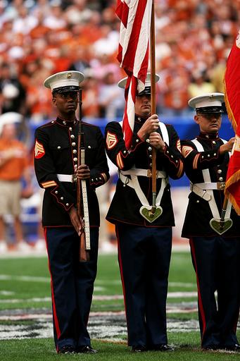 Keywords: honor guard sporting event flags uniforms spectators football stadium competition event field arena american football stadium crowd culture men american people sport texas
