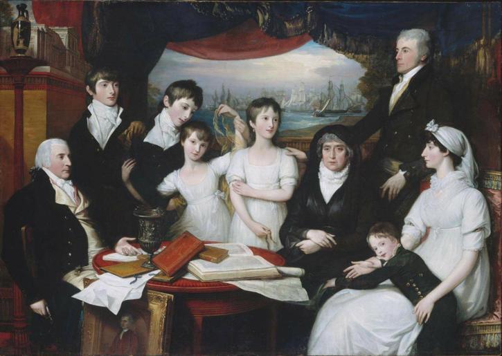 Keywords: Hopefamily.GIF oil canvas cm 183 2 258 44 Institution Museum of Fine Arts Boston accession number object history credit line Painted about 1804 in London when the family was in exile from French invading forces in Amsterdam Ann Goddard was the apple of Henry's eye until she started an affair with Baron van Dopff This painting was partially to repair her marriage and it didn't work As soon as Henry died she moved in with Dopff When John Williams died she married Dopff Henry is pointing to the ashes of John Goddard his brother-in-law and business associate and above his head rests a model of Welgelegen http //www mfa org/collections/object/the-hope-family-of-sydenham-kent-31279 PD-old-100 19th-century family portraits Portraits by Benjamin West Portrait paintings in the Museum of Fine Arts Boston 1800s portrait paintings Paviljoen Welgelegen Henry Hope Portraits with image of family member Hope Co