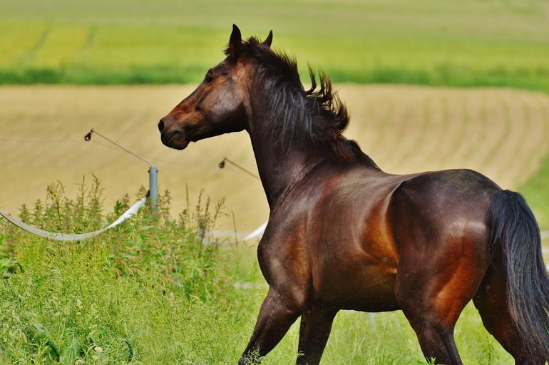 Keywords: horse coupling stallion eat paddock brown meadow pasture graze nature grass green