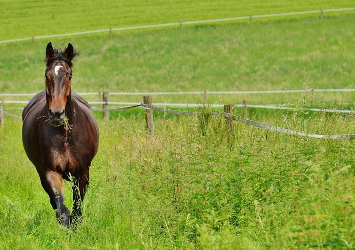 Keywords: horse coupling stallion eat paddock brown meadow pasture graze nature grass green play romp