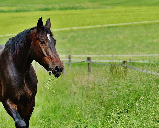 Keywords: horse coupling stallion eat paddock brown meadow pasture graze nature grass green play romp