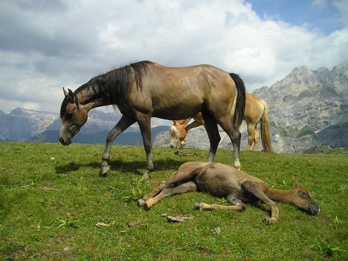 Keywords: horse foal flock family pasture brown mare dolomites mountains alpine south tyrol italy animal nature mammal fur