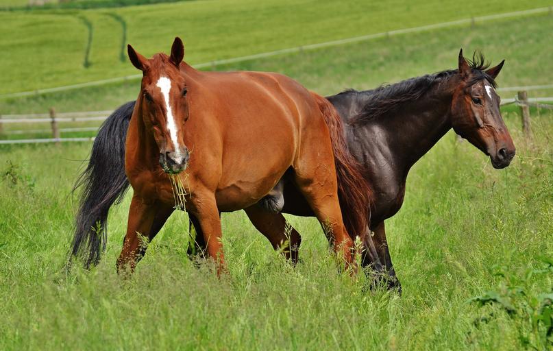 Keywords: horses for two coupling stallion eat paddock brown meadow pasture graze nature grass green play romp