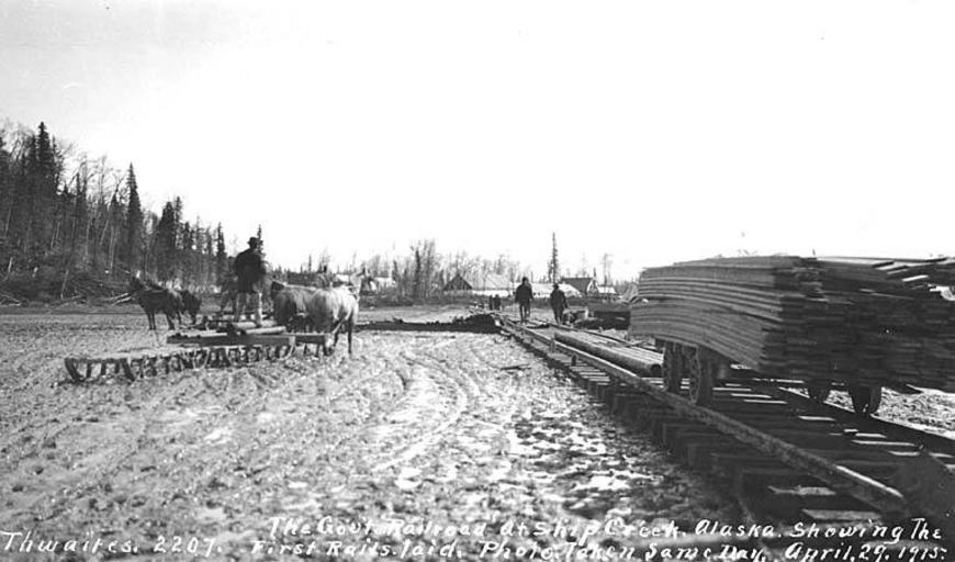 Keywords: Horses pulling sleds over mud and first rails laid for the Alaska Railroad at Ship Creek, April 29, 1915 (THWAITES 213).jpeg check categories 27 October 2016 6 Photograph Creator John E Thwaites Caption on image The Gov't Railroad at Ship Creek Alaska Showing the first rails laid Photo taken same day April 29 1915 PH Coll 247 466<br/>In 1915 President Woodrow Wilson authorized funds for the construction of the Alaska Railroad Ship Creek Landing was selected as the headquarters of this effort coordinated by the fledgling Alaskan Engineering Commission A Tent City sprang up in the wilderness at the mouth of Ship Creek and soon swelled to a population of over 2 000 On July 9 1915 the Anchorage townsite auction was held and over 600 lots in a fixed grid were sold for approximately 150 000 Although the area had been known by various names in this same year the U S Post Office Department formalized the use of the name Anchorage and despite some protests the name stuck Subjects LCTGM Horse teams--Alaska--Anchorage; Railroad tracks--Alaska--Anchorage; Dwellings--Alaska--Anchoarge; Men--Alaska--Anchorage; Alaska Railroad--People--Alaska--Anchorage; Alaska Railroad--Equipment supplies--Alaska--Anchoarge; Ship Creek Anchorage Alaska Subjects LCSH Sleds--Alaska--Anchorage depicted place Anchorage Alaska 1915 Institution University of Washington UWASH-THWAITES-source accession number thwaites 213 PD-old-auto-1923 1940 Information field Order Number THW241 Images from the John E Thwaites Photographs of Alaska Collection to check Horse teams Rail tracks Men Alaska Railroad Sleds Anchorage Alaska |