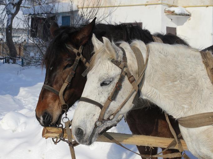Keywords: horses winter animal road cart head domestic chestnut white slavnoe ukraine