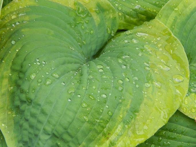 Keywords: hosta leaf flora nature gardening rain water green droplets raindrops liquid drops of water rain drops moist foliage plant garden