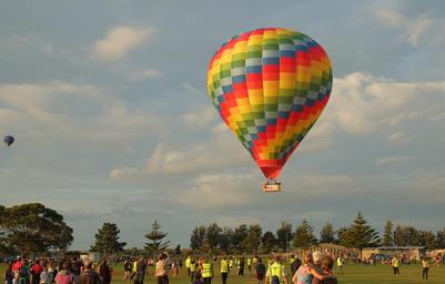 Keywords: hot air balloon landing descending crowd colorful daylight