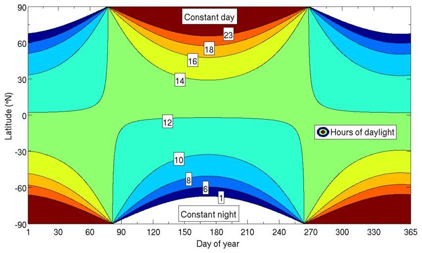 | View Original: | Hours of daylight vs latitude vs day of year.png (1225x735) | |||