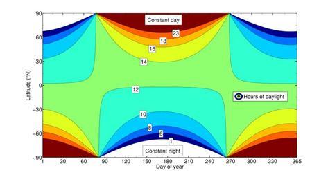 | Keywords: Hours of daylight vs latitude vs day of year.svg A contour plot of the hours of daylight as a function of latitude and day of the year using the most accurate models described in Sunrise equation This SVG is interpreted differently by firefox inkscape and the wikimedia software I provide this SVG version so people can make other versions if they want I also provide my own PNG version for immediate use Own 2010-02-03 Jalanpalmer <span class signature-talk >talk</span> Hours_of_daylight_vs_latitude_vs_day_of_year png Day length Mean meteorological data of the world Meteorological diagrams Astronomical diagrams Contour plots |