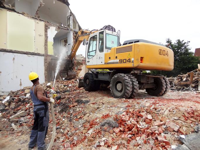 Keywords: house demolitions house demolition excavators water hose construction workers helm building rubble demolition company water dust dirt