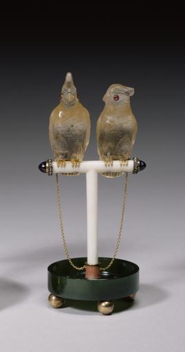 Keywords: House of Fabergé - Pair of Cockatoos - Walters 571913 - View B.jpg Walters Art Museum artwork Creator House of Fabergé Perched on a T-shaped ivory stand is a pair of topaz cockatoos with ruby eyes and gold feet They are connected by gold chains to a pink enamel and gold mount set in a nephrite base supported by four gold ball feet Carl Fabergé was particularly fond of birds and kept a pet cockatoo early Other date century 20 topaz tourmaline rubies gold ivory enamel nephrite sapphires diamonds cm 10 16 accession number 57 1913 32058 Dr N Dorin Ischlondsky date and mode of acquisition unknown Walters Art Museum Gift of Dr N Dorin Ischlondsky 1961 Objects of Vertu Precious Works of the Eighteenth Century The Walters Art Gallery Baltimore 1984 The Fabergé Menagerie The Walters Art Museum Baltimore; Columbus Museum of Art Columbus; Portland Art Museum Portland 2003-2004 place of origin St Petersburg Russia PD-old-auto 1920 Fabergé animal figurines Collections of the Walters Art Museum Sculptures of birds Topaz objects Tourmaline objects |