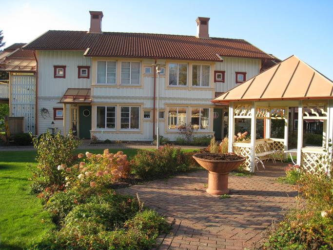 Keywords: house grass sky chimneys gazebo plants autumn window roof doors