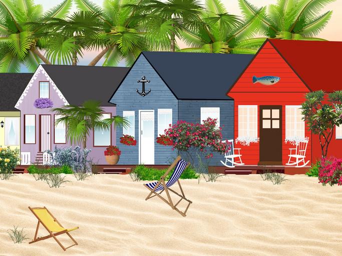 Keywords: houses cottages beach window flowers sandy beach seaside palm house chairs red blue purple yellow holiday