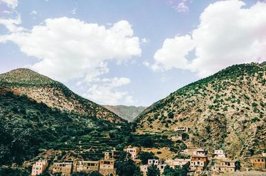 Keywords: houses village town mountains hills blue sky clouds sunshine
