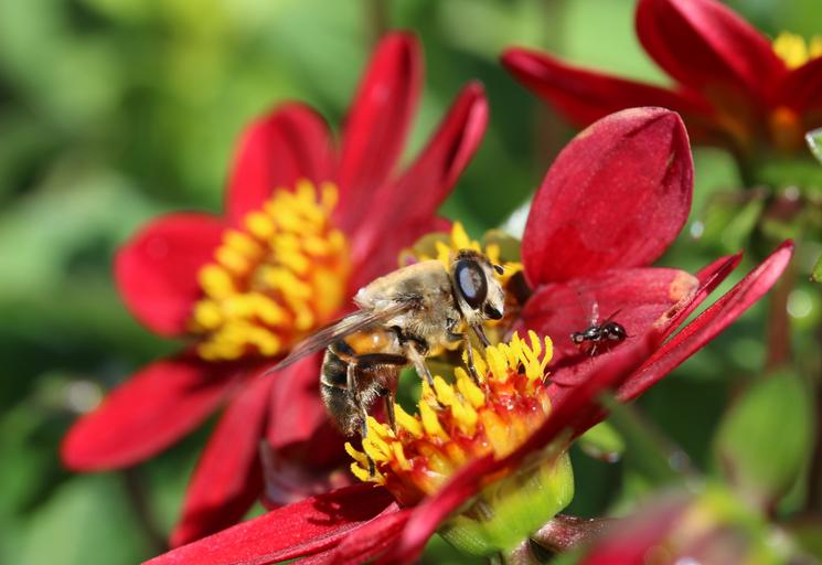 Keywords: hoverfly dung fly insect nectar search collect nectar dahlia mignon-dahlia red animal flower nature flying ant in anflug