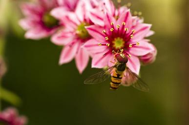 Keywords: hoverfly houseleek garden blossom bloom pink mimicry insect