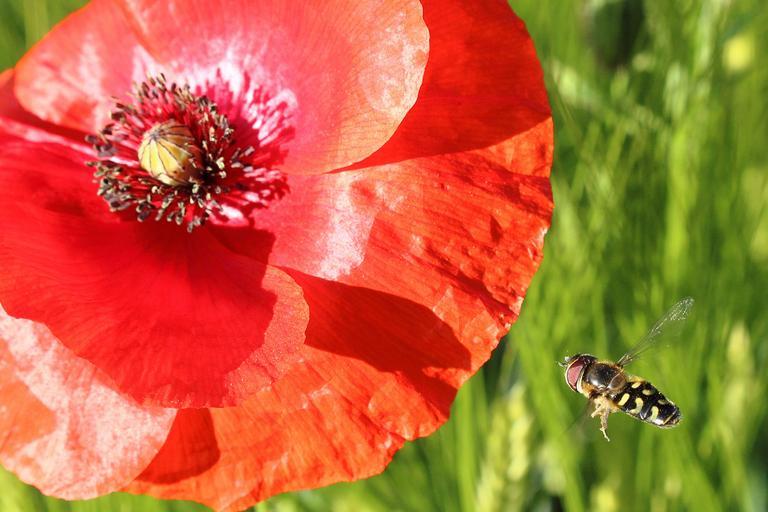 Keywords: hoverfly insect fly approach blossom bloom field macro close wing poppy poppy flower pollination red