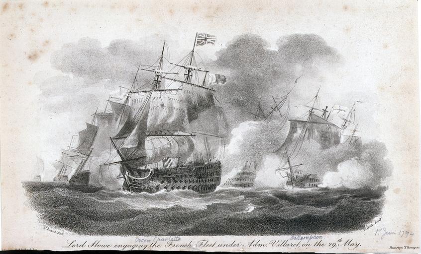 Keywords: Howe engaging the French 1st June.jpg en Lord Howe engaging the French Fleet under Adm Villaret on the 29th May aquatint by Wells after original by Nicholas Pocock 1794 published by Bunney Thompson Co Vignette from Naval Chronicle Howe's Queen Charlotte is shown on the starboard tack with double-reefed topsails and flying the Union Flag as Commander-in-Chief on the main leading through the French line She is followed by Rear-Admiral Sir Thomas Pasley's Bellerophon raking the French to both sides ru Ло д Хоув завязывает бой с ф анцузским флотом под командой адми ала Вилла е 29 мая иколас Покок; акватинта 17 июня 1794 В цент е флагман Queen Charlotte п о ывающий линию ф анцузов за ним Bellerophon конт -адми ала сэ а Томаса Пасли http //www philaprintshop com/navalengage html; another copy can be found at http //www nmm ac uk/collections/prints/viewPrint cfm ID PAD5462 National Maritime Museum collection PAD5462 Nicholas Pocock artist 1741-1821 ; Wells engraver; published by Bunney Thompson Co 1799 PD-old-100-1923 Queen Charlotte ship 1790 Glorious First of June HMS Bellerophon ship 1786