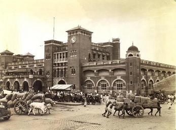 Keywords: Howrah railway station, Calcutta in 1945.jpg Sacred cattle and coolies push and pull great carts to the loading platform of the Howrah railroad station in background on of the city's two stations Howrah is on the west bank of the river and Sealdah the other station is in another section of Calcutta on the east side The South Asia Section of the Van Pelt Library University of Pennsylvania recently acquired from a bookdealer a photograph album consisting of 60 photographs of Calcutta taken most likely between 1945-1946 The photographer Mr Clyde Waddell also provided the interesting glosses accompanying each photograph Several attested copies of this work has emerged including one with a 'title page' held by the Southeastern Louisiana University in Hammond Louisiana Mr Waddell was a military photographer Many of his captions sound like annotations that would be found in a typical military magazine The album begins with several general long shots of Calcutta and ends with a picture of dhobi-s washermen washing clothes The text accompanying the last photograph also sounds as if the author intended to finish with that picture of one of the great mysteries of India The annotations have been included because of their intrinsic interest not only to the photographs but to a 'typical' American impression of India at this time 1945 http //www library upenn edu/collections/sasia/calcutta1947/ Clyde Waddell other versions PD-USGov Van Pelt Library University of Pennsylvania - Clyde Waddell Calcutta 1940's photos Uploaded with UploadWizard Howrah station |