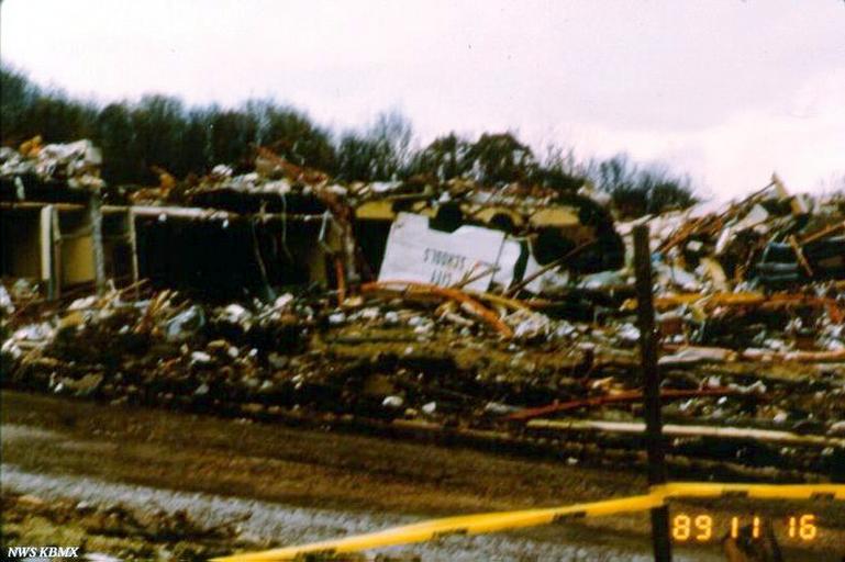 Keywords: Hsv damage 06.jpg en An overturned Huntsville City Schools maintenance vehicle labels the rubble of Jones Valley Elementary School in Huntsville Alabama which had been a two-story building prior to the November 15 1989 tornado This damage photographed the following day shows that the storm removed the top floor entirely All 37 students who were in the after school program survived because those running the program went directly under the stairs when the power went out not waiting for a tornado warning to be issued One parent outside died in her vehicle http //www al com/news/huntsville/index ssf/2014/11/the_airport_road_tornado_one_o htmlPhotographed by NWS Birmingham during their storm survey Damage from the November 15 1989 tornado to strike Huntsville Alabama photographed by NWS Birmingham during their storm survey 1989-11-16 http //www srh noaa gov/images/bmx/significant_events/1989/11_15/graphics/ C S;O D National Weather Service Birmingham Alabama office other versions PD-USGov 1989 Huntsville Tornado