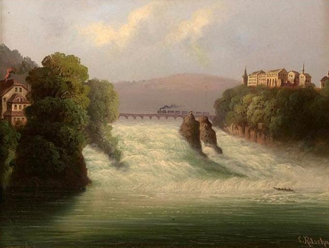 | Keywords: Hubert Sattler Rheinfall.jpg  de Hubert Sattler 1817 Wien “ 1904 Wien Der Rheinfall bei Schaffhausen<br/>Oil on canvas 21 x 28 cm before 1904 http //www auktion-wendl de/ Signed with the pseudonym L Ritschard PD-old-100 Stone arch bridges in art EisenbahnbrĂĽcke am Rheinfall Rheinfall in art Remote views of Schloss Laufen Historical images of Schloss Laufen |
