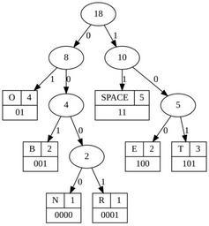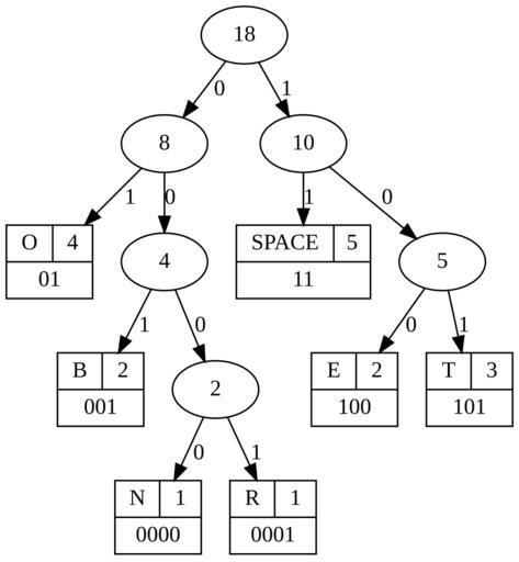 | Keywords: Huffman (To be or not to be).svg en Huffman tree based on the phrase To be or not to be de Huffmanbaum basierend auf der Phrase To be or not to be huffman ooz ie/tree dot text TO BE OR NOT TO BE huffman ooz ie 2013-05-19 <gallery>File Tobeornot png Old png version</gallery> Created with Graphviz Graphviz source <source lang dot > / Huffman Tree DOT graph DOT Reference http //www graphviz org/doc/info/lang html http //en wikipedia org/wiki/DOT_language Timestamp 1368947341 Phrase 'TO BE OR NOT TO BE' Generated on http //huffman ooz ie/ / digraph G edge label 0; graph ranksep 0; N shape record label 1 0000 ; R shape record label R 1 0001 ; B shape record label B 2 001 ; O shape record label O 4 01 ; E shape record label E 2 100 ; T shape record label T 3 101 ; SPACE shape record label SPACE 5 11 ; 18 -> 8 -> 4 -> 2 -> N; 10 -> 5 -> E;2 -> R label 1; 4 -> B label 1; 8 -> O label 1; 5 -> T label 1; 18 -> 10 -> SPACE label 1; </source> int license-header Cc-zero Images with Graphviz source code Huffman coding Hamlet Act III Scene I |