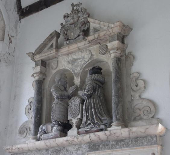 Keywords: Hugh&ElisabethFortescueWeareGiffardDevon.jpg en Figures of Hugh Fortescue and his wife Elizabeth Chichester top tier of Fortescue mural monument Weare Giffard Church Devon own photo own photo Monument 1639; photo Apr 2012 Holy Trinity church Weare Giffard Wall mounted church monuments in Devon |