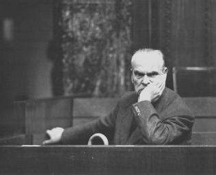 Keywords: Hugo-Sperrle.jpg Hugo Sperrle ex-Fieldmarshal of the German Air Corps sits remorsefully in the defendants dock of the High Command Case at Nuernberg during a morning recess of court A professional soldier who rose from the grade of Captain at the end of World War I the 63 year old was in command from 1936 to 1937 of German troops of the Condor Legion in Spain After his command in Spain he took command of an Air Group and in 1939 became Commander-in-Chief of Air Fleet 3 which bombed London during the blitz The thirteen defendants that were commanders of ground sea and air forces are charged with conspiring with the political leaders in overthrowing the Versailles treaty and of committing war crimes in their resulting aggressive warfare Original Descriptive Caption Date n d Provenance From Public Relations Photo Section Office Chief of Counsel for War Crimes Nuernberg Germany APO 696-A US Army Photo No OMT-XII-D-21 Citation Telford Taylor Papers Arthur W Diamond Law Library Columbia University Law School New York N Y TTP-CLS 15-2-3-176 High Command trial Hugo Sperrle Sitting with head resting on hand