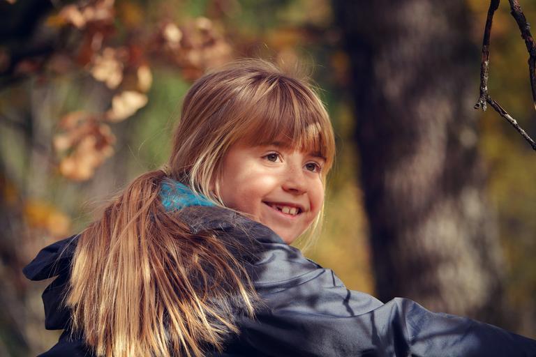 Keywords: human child girl blond long hair happy laugh face nature autumn trees